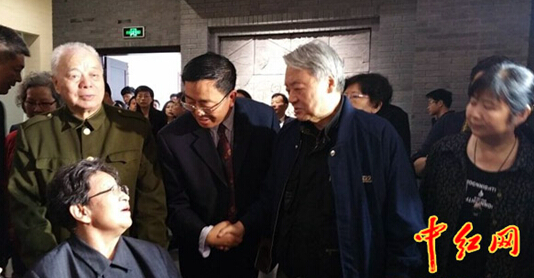 李讷(坐轮椅者)、王景清(左一)、毛远新(右二)、毛小青(右一)等亲属,参观毛泽民烈士展览。(中红网红色图库)