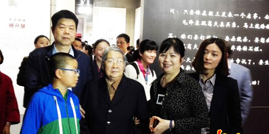 李敏(中)、毛小青(右二)、毛坚平(左二)等亲属,参观毛泽民烈士展览。(中红网红色图库)