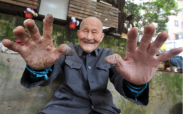 4月6日,在福州仓山区程埔路的一棵大榕树下,老人给记者看他的双手,因为反复修鞋的动作,他的指关节已经变形,两根拇指都向外弯曲,双手长满老茧和结块。王老伯已95岁高龄,是地地道道的福州人,自打十多岁从乡下来到程埔头一带当学徒,就一直生活在这里,以补鞋修鞋为生,迄今已修了80多年的鞋。