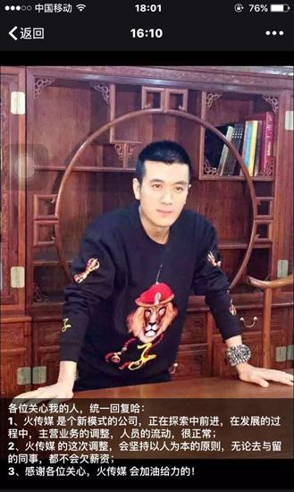 近日,有消息指火传媒解散,被裁的员工拿不到赔偿,而火传媒法人正是黄圣依的老公杨子,针对此事,杨子在朋友圈统一回复称人员流动很正常,无论去留的同事,都不会欠薪资。