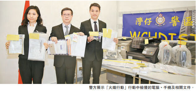 警方早前接獲市民舉報,灣仔重案組探員接手調查,至前日采取「火熾行動」,掩至灣仔區一座商業大廈,成功瓦解一個借貸詐騙集團,拘捕3名男子,涉案金額約20萬元,行動中檢獲電腦、手機及相關文件。