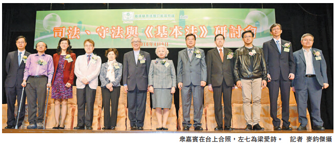 香港基本法推介联席会议昨日举行「司法、守法与《基本法》研讨会」,邀请梁爱诗担任主礼嘉宾,并邀请香港大律师公会罗沛然、香港律师会副会长彭韵僖、香港大学法学院首席讲师张达明、维护法纪关注组何君尧为主讲嘉宾。香港基本法推介联席会议副主席黄均瑜在致辞时表示,香港是世界上治安最好的城市之一,但自从非法「占中」开始,便有部分人假「公义」之名,号召公众公民抗命,认为这种做法正在蚕食社会的守法意识。