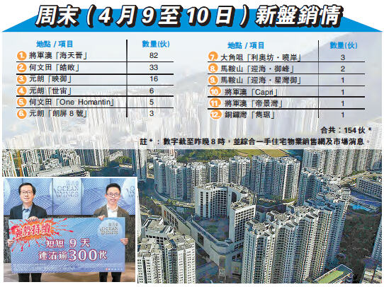 受多個新盤開售帶動,一手市場交投氣氛持續升溫。綜合一手住宅物業銷售網及市場消息,截至昨晚8時正,市場共錄154宗一手買賣成交,當中新地(016)「海天晉」獨領風騷,單日沽出約82伙,占可推單位逾八成,此外同系「天鑄」第二期,亦乘勢加推42伙,價單平均尺價約3.28萬元。