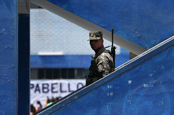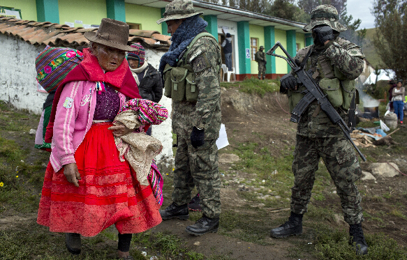 4月10日,在秘鲁首都利马,一名士兵在被用作投票点的学校巡逻。