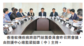 【香港商报网讯】记者周伟立报道:蚊传疾病跨部门统筹委员会昨日下午召开会议,审视寨卡病毒感染和登革热的最新情况,以及讨论防蚊措施的经验,好让与会19个决策局及部门参考食物环境徖生署的防蚊经验。当局又呼吁市民定期清理积水,以免滋生蚊虫,而在户外活动期间,亦应做好个人保护措施,避免在丛林逗留。