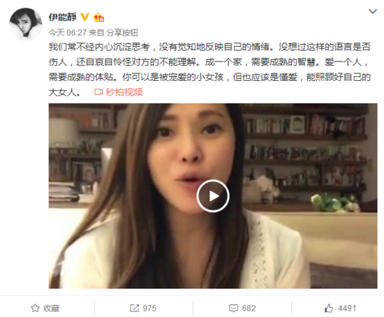 凤凰娱乐讯 4月12日,伊能静在微博上分享出一段视频,并留言道:“我们常不经内心沉淀思考,没有觉知地反映自己的情绪。没想过这样的语言是否伤人,还自哀自怜怪对方的不能理解。成一个家,需要成熟的智慧。爱一个人,需要成熟的体贴。你可以是被宠爱的小女孩,但也应该是懂爱,能照顾好自己的大女人。”