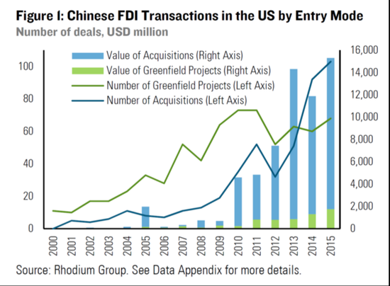 這份報告援引榮鼎集團的China Investment Monitor匯編數據顯示,中國投資者2015年對美國的投資超過150億美元,涉及171樁交易,今年還有超過300億美元的交易和項目等待達成。該機構追蹤了2000年開始中資企業在美國的直接投資。報告顯示,這些投資去年為美國增添了13,000個全職職位,使得過去15年新增職位總數超過90,000個。