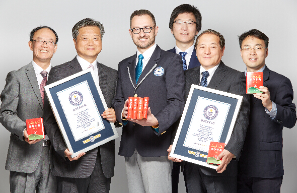 4月12日,在英国伦敦,吉尼斯世界纪录机构高档副总裁马尔科·弗里加迪(左三)向中国出版集团公司总裁谭跃(左二)和商务印书馆总经理于殿利(右二)颁发两个纪录证书。