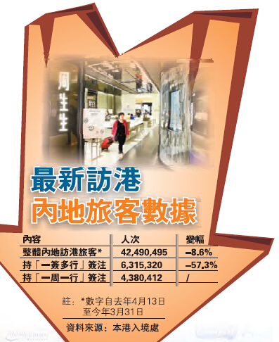 據入境處最新數字,去年4月13日至今年3月底,整體內地訪港入境人次約4249萬人次,按年下跌8.6%。當中,持「一簽多行」簽注來港者約631.5萬人次,按年下跌57.3%;另有438萬人次持「一周一行」簽注來港。另外,旅發局資料亦顯示,今年2月本港所有酒店平均入住率僅79%,為2010年2月以來首度跌穿80%,同月平均房價亦按年跌10%。