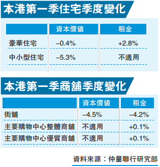 至於商舖租金方面,情況亦不遑多讓。數據顯示,期內本港街舖租金按季續跌4.2%,但數字已較去年第四季約5.1%的跌幅有所收窄,該行商舖部主管陳耀認為,隨現時業主商議租約時態度較以往軟化,因此預期未來數月商舖空置率及租金將逐步回穩,估計今年租金跌幅介乎10%至15%。