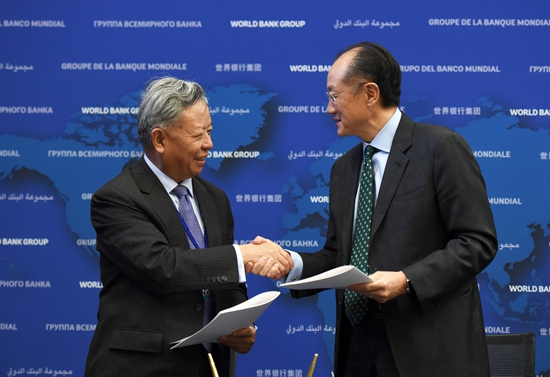 4月13日,在美國華盛頓,亞洲基礎設施投資銀行行長金立群(左)與世界銀行行長金墉共同簽署協議。亞洲基礎設施投資銀行行長金立群13日在華盛頓與世界銀行行長金墉簽署了首份聯合融資框架協議,為雙方今年的合作打下基礎。新華社記者殷博古攝