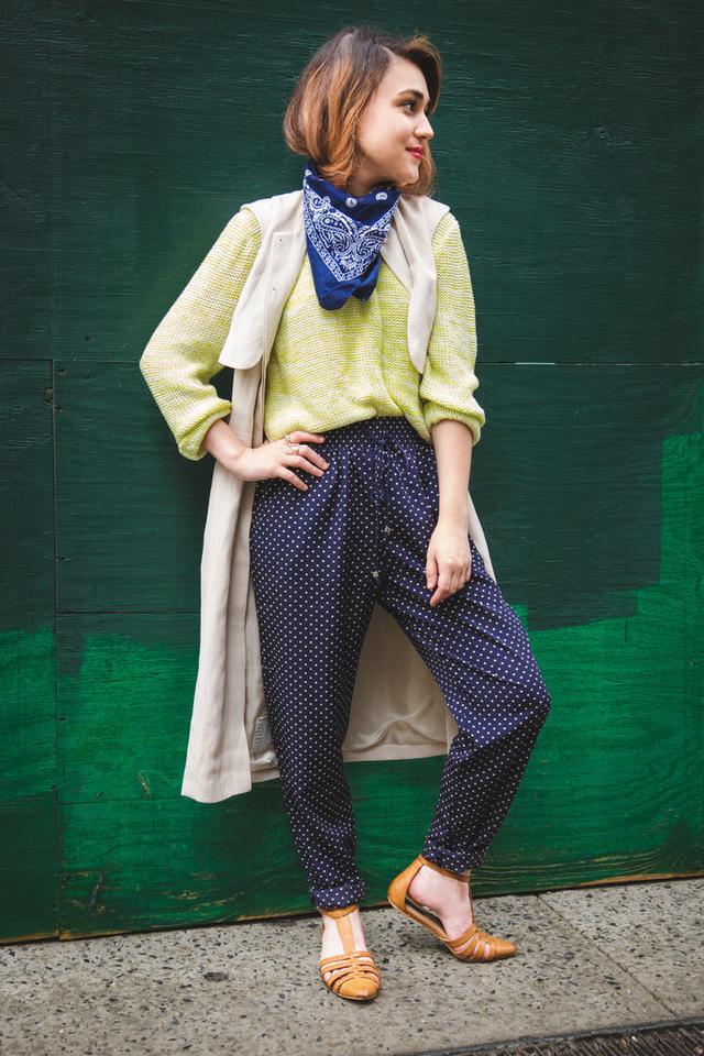 想要变身 elegant,就当然要穿 high heels!印花裙子挑深色的,高雅感立即现身,背心裙子配背心长外套,没有那么 formal 却有上班族的感觉。