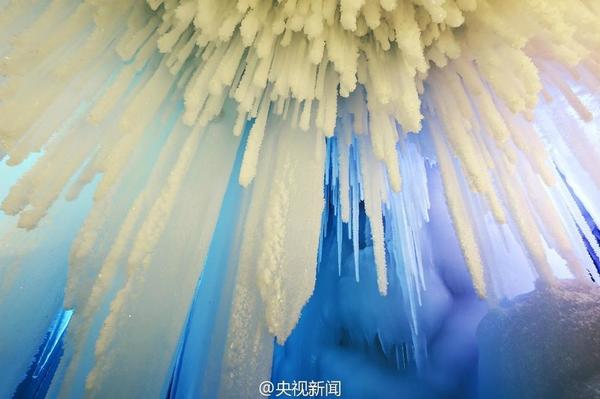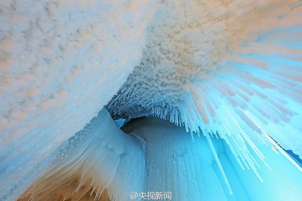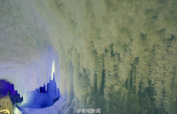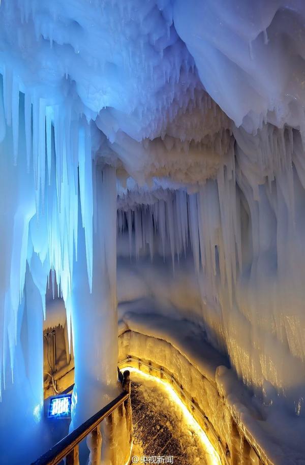 山西省宁武县芦芽山有着中国已知最大的冰洞,洞深100多米。夏天洞外温度高达近40℃,洞内却始终恒定在-4℃以下,晶莹剔透的冰笋、冰柱、冰锥、冰葡萄随处可见,然而其形成原因至今仍是个谜。(央视记者裴大伟摄影王权)