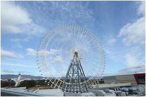 据报道,日本最高的摩天轮(edhorse Osaka Wheel)高约123米,将于7月1日在大阪府吹田市的万博纪念公园(Expocity)内开始运行。这部摩天轮共有72个客舱,舱底采用透明玻璃设计,其中有两个客舱是座位灯光特别设计的VIP专舱。首次采用免震构造,有空调和电视,坐一圈约18分钟。