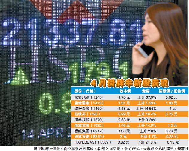 【香港商報網訊】記者伍敏報道:港股昨締七連升,創今年來收市高位,收報21337點,升0.85%,大市成交846億元,資金追炒落後內險股及半新股。今天內地將公布首季國內生產總值等一系列經濟數據,市場憧憬正面。惟昨天恒指於21500關口明顯受阻,市場普遍預期,港股後市有待調整後再發力。