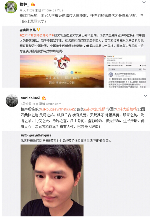 去年,當悉尼大學的中國留學生代表對其表示強烈譴責時,他發布微博諷刺中國留學生的智商,稱他們“要花錢找論文代寫”,并侮辱留學生為“留學豚”,意為“豬”。