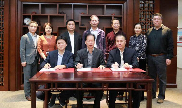陈红天(前排中)昨与合作方签署股权收购协议。
