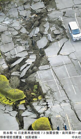 【香港商報網訊】當地時間16日凌晨1時25分,日本熊本縣再遇7.3級強震,震源深度12公里,南阿蘇村出現大規模塌方,山體大面積垮塌。截至昨晚數據,继14日發生第一次地震,日本兩次地震已增至41人喪命。日本氣象廳指出,14日晚9時26分觀測到的熊本縣規模達6.5級地震只是「前震」,16日凌晨這場地震才是主震,而今次地震所影響的範圍也比14日那次更廣。