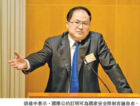 胡建中亦提到,近來有打本土自主旗號的團體興風作浪,妄言廢除《基本法》,更企圖組團參政,「搞糟」立法會選舉。他又形容,分離主義思潮正在蔓延;又指,即使在國際公約中,也有規定為國家安全可以限制言論自由,並以刑事條例檢控那些煽動仇視中央政府等反政府、反國家的言論或宣傳行為。