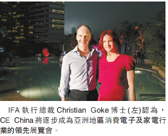 Goke說:「現在就是將IFA概念帶入一個全新層次的最佳時機,面對專業觀眾和消費者,我們將重點關注品牌和產品,把舉辦IFA的成功經驗帶到中國市場。CE China將逐步成為亞洲地區消費電子及家電行業的領先展覽會。只有IFA品牌的強勁實力以及IFA的品質理念才能讓CE China在組織成立和公共關係上贏得先機。」