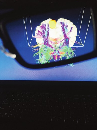 聯影展示了用虛擬現實眼鏡觀看人體大腦解剖結構的技術,可開發應用于遠程醫療。圖中黃色部分為腫瘤,彩色部分是各類神經。本報記者唐聞佳攝