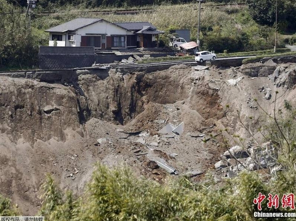 熊本地震造成道路坍塌,一輛汽車懸掛在塌陷的山坡邊緣。當地氣象預報顯示,近日有可能大雨甚至是暴雨。由地震引起的地盤松動很可能引發泥石流、土石塌方之類的嚴重次生災害。對此,有關方面已經向更大區域內的當地居民發出避難警告。