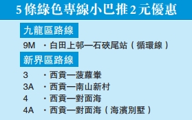 該5條服務深水及西貢區的路線(見表)由兩個營辦商營運。整個優惠計劃將包括501條綠色專線小巴路線,共涉及156個營辦商,分別覆蓋全港約97%的綠色專線小巴路線及約98%的營辦商。