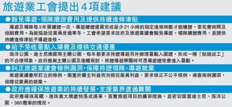 香港旅遊業僱員總會總幹事林挺華建議,政府應豁免導遊、領隊續證費用及提供持續進修津貼、給予免收景點入場費及提供交通優惠、糾正旅遊業議會條例漏洞,保障持證領隊、導遊就業及確保旅遊業的持續發展,支援業界渡過難關。