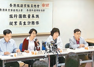 香港專業導遊總工會主席余莉華分析,去年12月至今年2月,整體共接到1萬多個旅行團,每日平均約有130團,數字較去年減半,而近期相繼有零售店、酒樓結業,甚至迪士尼樂園都在裁員形勢來看,旅遊業已進入寒冬,且短期看不到有「回暖」的希望。她透露,由去年12月起,絕大部分導遊已處於停工或吊鹽水狀態,收入減少六成以上,生活只能靠平時積蓄維持,實在捉襟見肘。