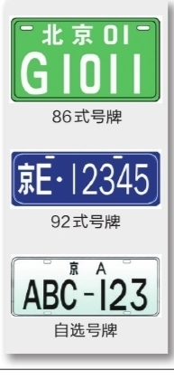 建國初期,中國實行的是86式車牌,有人說是抄襲日本。這種車牌分為兩行,上面一行小字表示“發證機關代碼”,省市區全名+兩位數字序號(0199),使館車是三位數。下面一行大字是五位編碼。小車綠牌,大車紅牌,外籍車黑牌,教練車、試驗車藍牌,等等。