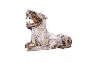 2001年发掘时,考古工作者在金沙遗址出土了大量石器,其中以12件跪坐石人像与10件立体圆雕石虎最为传神。现在,游客同样可以在金沙遗址博物馆中观赏到这些3000年前富于狞厉之美的艺术品。石虎大张方口,肌肉遒劲,眼睛、耳部和嘴部都涂有鲜明的朱砂。出土时,石虎张开的大嘴正对着跪坐石人像的胸部,旁边还摆放着一件石蛇和一些石璧。这应该是一种特殊的祭祀行为。