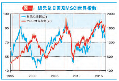 日圓與高息貨幣及股市關系向來受到市場注目。自1995年日本進入低息期后,以近十多年息差最闊的紐元兌日圓與MSCI世界指數計算(圖一),紐元兌日圓與股市關系算是同向,當中在2000年后更明顯。以往經濟好景間,大戶借日圓沽日圓來買風險資產。到金融危機時,資金返日令日圓拆倉,高息貨幣與股市暴跌,而到今天這關系似乎仍在。