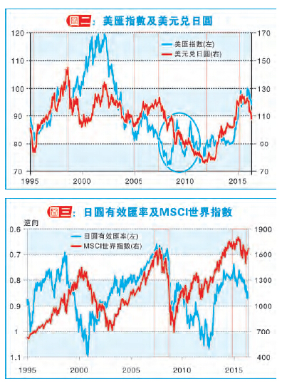 另外,若見到日圓強得有點異常,大家便要加倍小心。圖二見到2008年3月(藍色圓圈)美元兌日圓持續下滑間,美匯指數卻反彈,那代表比起美元,日圓有著更大量資金涌入令美元兌日圓下滑,這異常現象或反映有大事發生,當時就出現了9月的雷曼倒閉。總括而言,股民大多落后大市,但市場總有聰明人,知道聰明錢的流向,或可助大家避過一劫。今年美國應會加息兩次,美元或仍可站在強方,但若開始見到日圓不斷走強,美元兌日圓續試105、100等水平。聰明錢,你應該見到了吧!