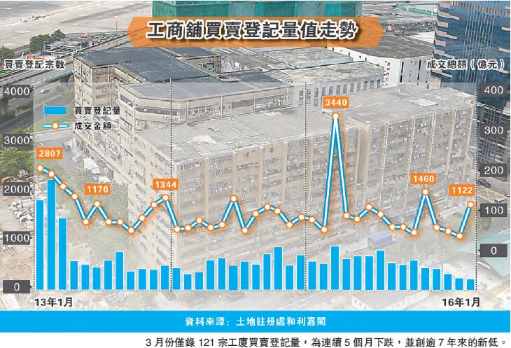 據利嘉閣(工商舖)公布數據顯示,今年3月份全港工商舖物業買賣登記量按月下跌3%至錄237宗,除屬連續5個月錄得負增長外,亦創自1996年有紀錄以來的新低。惟數據反映,期內除工廈項目買賣外,包括商廈及商舖在內的交投量均出現明顯反彈,當中商廈買賣登記按月升幅更達到四成,至整月錄得49宗,同時帶動該類物業買賣合約總值急增10.3倍,至錄得約82.5億元,創出近一年來的新高。