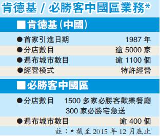 據了解,百勝的內地業務,除了肯德基及必勝客的內地業務,亦包括從事火鍋店、早年曾到香港上市的小肥羊。據資料顯示,自1987年肯德基於北京設立首家分店以來,截至2015年12月底止,其分店數目已多達5000家以上,遍布城市數目逾1100個,以特許經營模式為主。