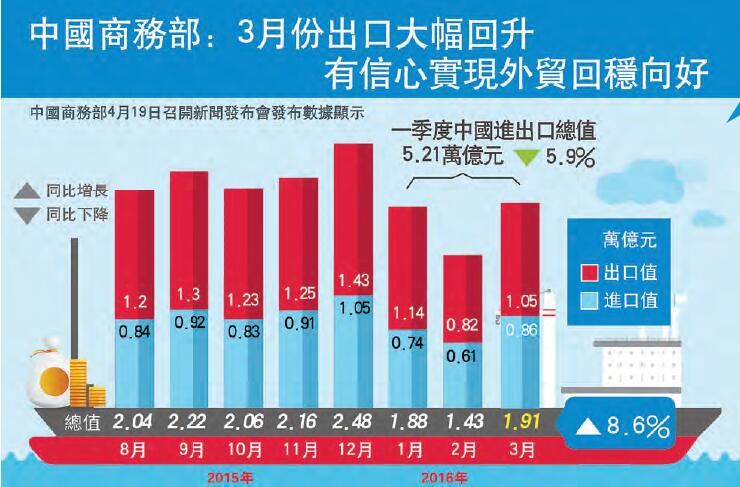 關於對外貿易情況,沈丹陽介紹,據海關初步統計,一季度,全國進出口總值5.21萬億元,同比下降5.9%;按美元計,一季度,全國進出口總值8021.4億美元,同比下降11.3%。在一季度進出口增速「雙降」的情況下,3月當月出口實現了18.7%的同比增長。