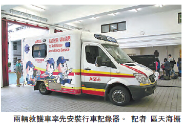 消防處副消防總長楊恩健稱,由今日開始會試驗在救護車上安裝行車影像記錄器,共有兩輛救護車參與,每輛車會在車外安裝6個鏡頭,測試為期半年,涉及3.7萬元。該6個鏡頭分別安裝在車頭、兩邊車身、車頂及車尾,已安裝鏡頭的救護車會貼上識別標誌,消防處會在測試完成後檢討成效,決定是否進一步擴展計劃。楊恩健說,處方在明年2月前,將會在140輛前線消防車上安裝鏡頭,佔消防車總數約二成半。