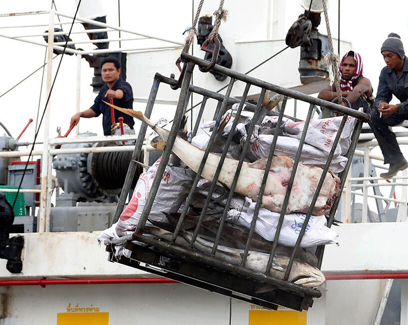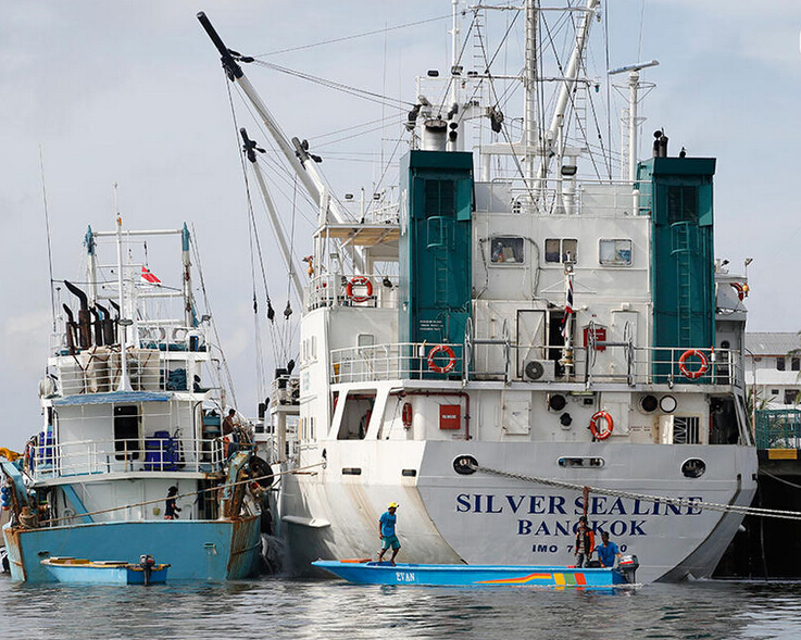圖為2014年11月22日,印尼本吉納,工人們將漁獲裝載上開往泰國的貨船。