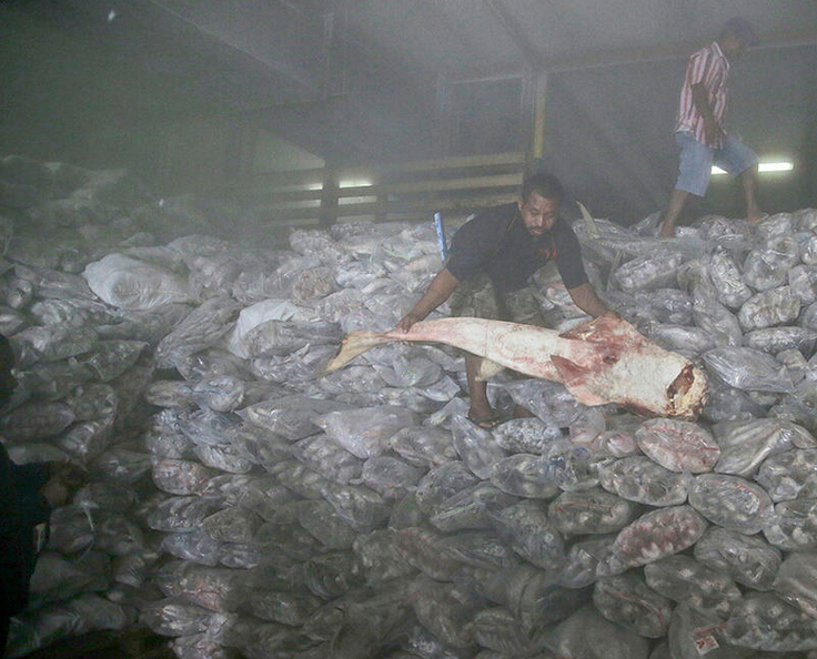 圖為2015年4月2日,在本吉納一家漁業公司的冷庫里,一名工人展示一條鯊魚。