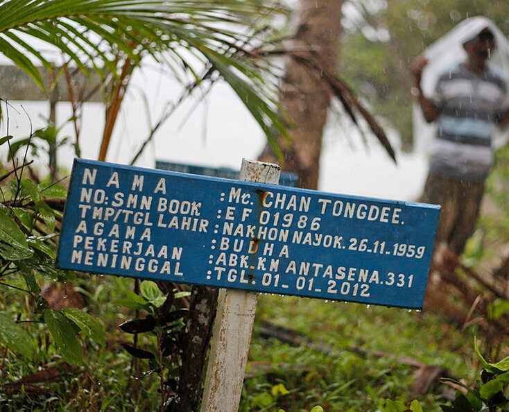 大量勞工反映,許多人在船上致殘甚至喪命。“如果美國人、歐洲人吃到這些魚,他們應該記住我們”,一位從本吉納逃脫的30歲勞工說,“海底肯定尸骨如山,可以堆成一座小島,死的人就有那么多”。有些勞工被埋在島上的雨林里,墓碑上的姓名仍是被騙上船時的假名字。