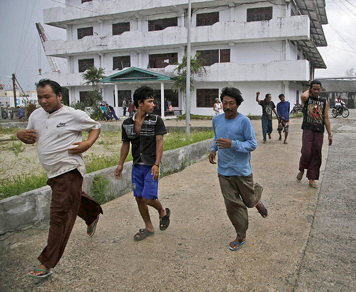 圖為2015年4月3日,緬甸勞工奔跑著前去收拾他們的行李,生怕走慢了,又被留在這座“奴隸之島”。