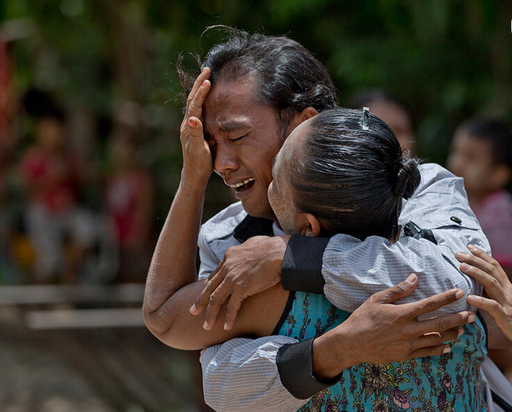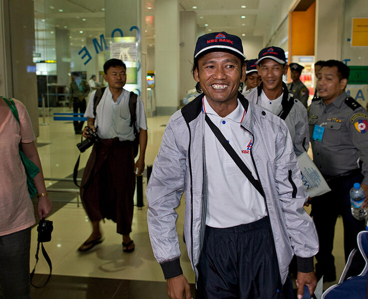 圖為獲救奴工之一、40歲的敏特時隔22年回到自己的祖國緬甸,與家人團聚。