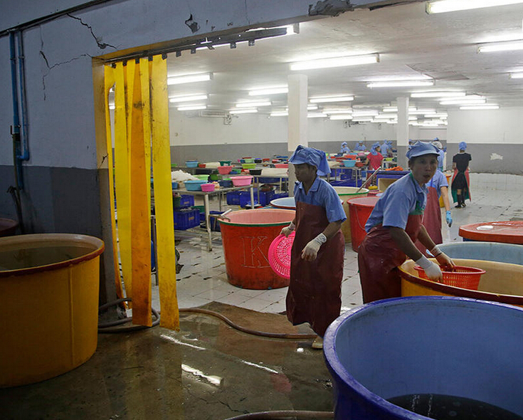【Part3:泰國“血汗大蝦”】2015年的9月-12月間,美聯社赴泰國龍仔厝揭發血汗剝蝦工場,距離曼谷僅1小時車程的龍仔厝府,存在著數以百計血汗工廠,大批勞工被禁錮在內,他們在這里沒有姓名,只有編號,不論傷病每天被迫工作,清洗蝦只、剝殼去腸。這里是另一個本吉納,來自柬埔寨、老撾和緬甸等國的勞工們向“中間人”交納一筆不菲的費用偷渡而來,而到手的工資卻少得可憐。AP Photo/Dita Alangkara