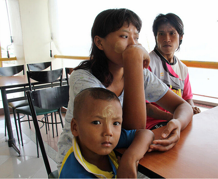 圖中這名24歲的母親Khine Zin Soe在龍仔厝一家蝦工廠工作,此前她懷有8個月身孕的時候在廠房內流產,流產后大出血期間她被強迫連剝4天蝦殼;圖中孩子是她2歲半的兒子,他曾從蝦工廠內一處近4米高的兩層樓上摔下后不省人事,而工廠老板卻拒絕將其送往醫院。AP Photo/Esther Htusan