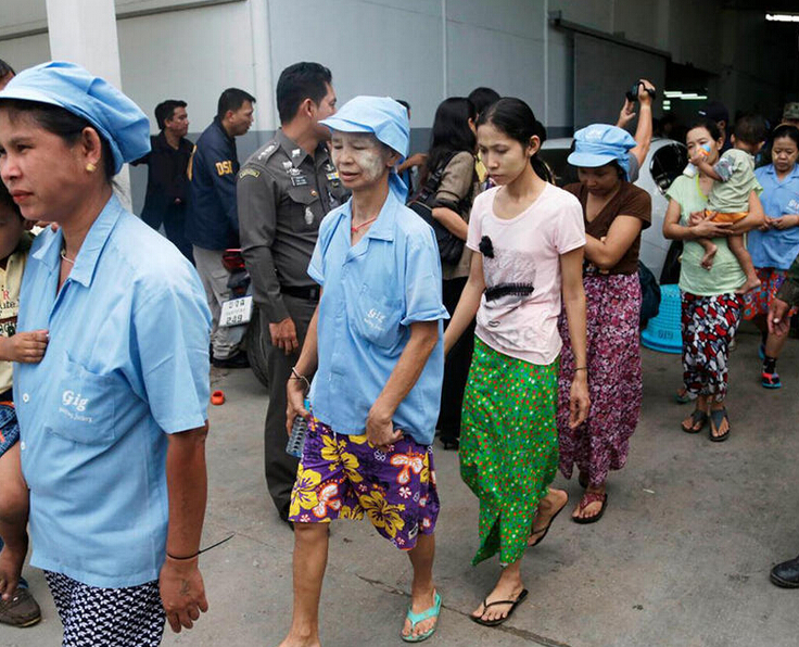 2015年11月9日,泰國特別調查組隊對龍仔厝一家蝦工廠進行突擊,士兵和警察疏散勞工。泰國政府稱當局已采取相應手段制裁人口販賣等違法行為,其中一家涉事工廠也已被關閉,但這間工廠的工人們卻被轉移至同一老板的另一間廠房。AP Photo/Dita Alangkara