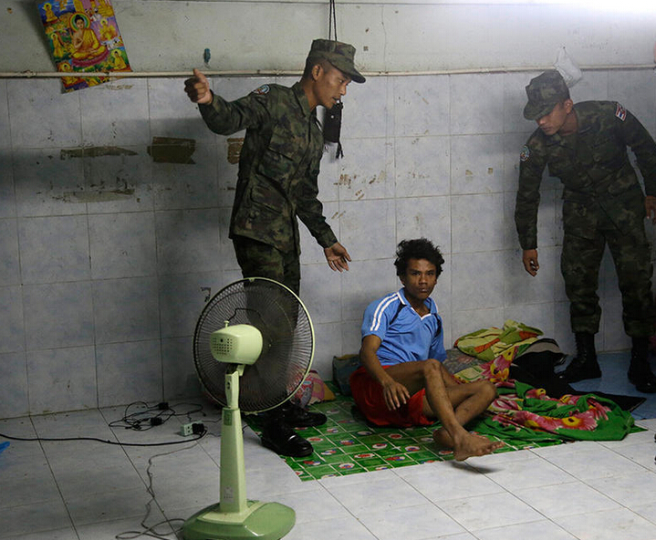 圖為2015年11月9日,泰國龍仔厝,泰國官方對蝦工廠的突擊行動中叫醒了一名工人。AP Photo/Dita Alangkara