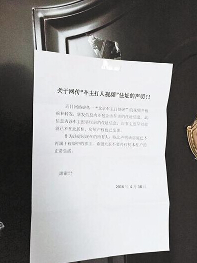 昨日,北青報記者撥打了上述電話號碼,語音提示該號碼已停機。隨后,北京青年報記者來到網友曝出的打人者李某的住所,多次敲門后無人回應,但戶主在大門上貼了一張名為“關于網傳車主打人視頻住址”的聲明。