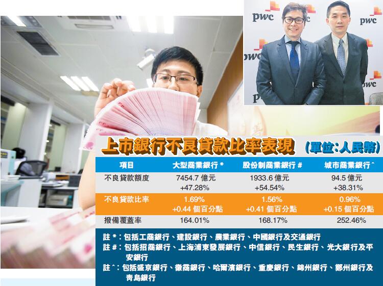 羅兵咸永道合共分析內地18所上市銀行的業績,該行昨日發表《2015年度中國銀行業回顧與展望》報告指,上述18家銀行的平均利潤增長率,由2014年的7.39%,大幅下降至去年的1.91%;至於不良貸款比率,則由2014年的1.22%,升至去年的1.65%,按年增長0.43個百分點。