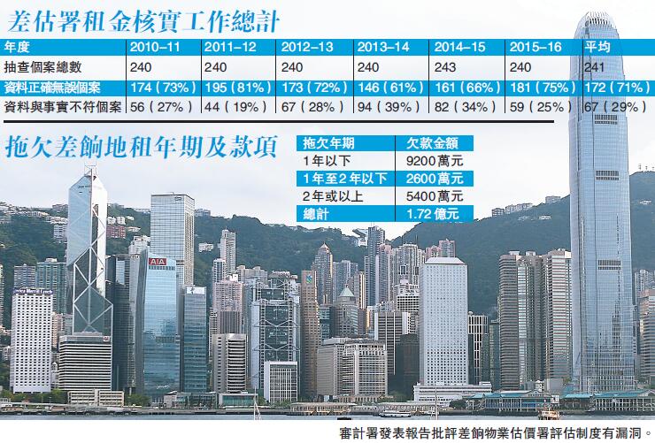【香港商報網訊】記者馮仁樂報道:差餉物業估價署評估制度被揭有漏洞。審計署衡工量值報告指出,截至去年9月,欠交差餉及地租總額逾1.72億元,部分個案甚至拖欠超過9年仍未能追討。報告又發現,過去5年只有約71%個案申報準確,部分業主更沒有申報其物業有否分間或合併單位(?房),建議署方改善應課差餉租值申報制度。