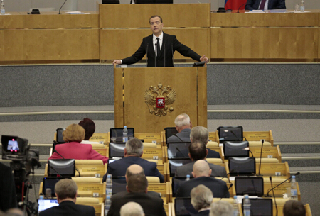 4月19日,在俄羅斯首都莫斯科,俄羅斯總理梅德韋杰夫在國家杜馬(議會下院)作政府工作報告。